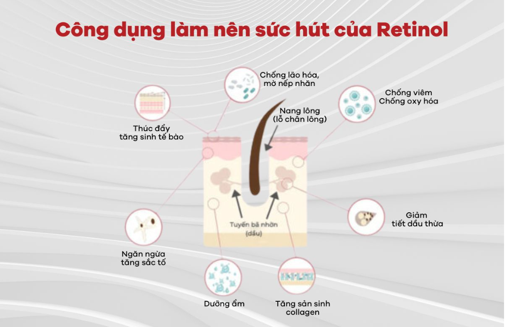 - Hỗ Trợ Trị Mụn Hiệu Quả: Retinol giúp kiểm soát dầu thừa, làm thông thoáng lỗ chân lông và giảm sưng viêm, từ đó giảm mụn đáng kể.