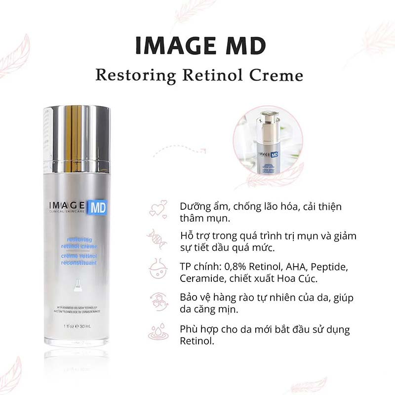 Chỉ sử dụng vào buổi tối. Làm sạch da với sữa rửa mặt cho da lão hóa, lấy 1 lượng kem vừa đủ Image MD Restoring Retino.l Creme (khoảng 1 hạt đậu). Thoa lên vùng da cần điều trị và massage cho dưỡng chất thẩm thấu vào da. Trong thời gian đầu dùng 2-3 lần/ tuần hoặc theo hướng dẫn của bác sĩ/chuyên gia. Vào ban ngày, bắt buộc thoa kem chống nắng phổ rộng có SPF30+ để ngăn ngừa tình trạng sạm da không mong muốn. Kết hợp với các sản phẩm dưỡng ẩm phục hồi để nuôi dưỡng làn da khỏe mạnh nhé!